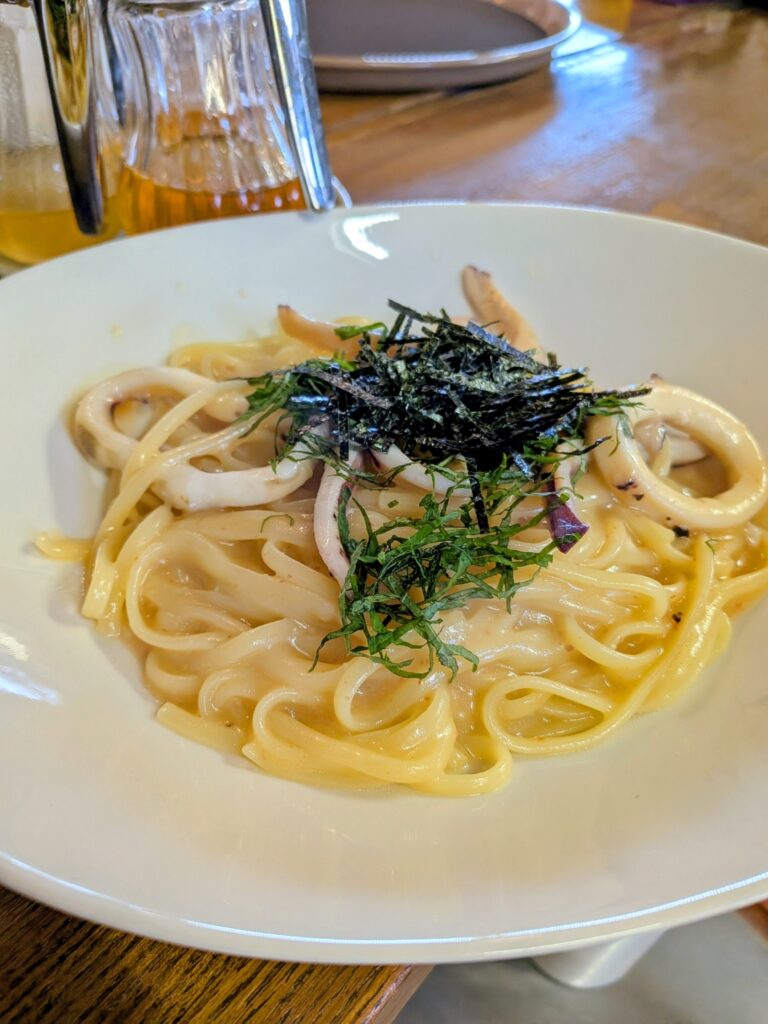 イカ明太和風生スパゲティ 1280円(テイクアウト不可)+400円でサイドメニューとソフトドリンクを一品ずつ、お選びすることができます。